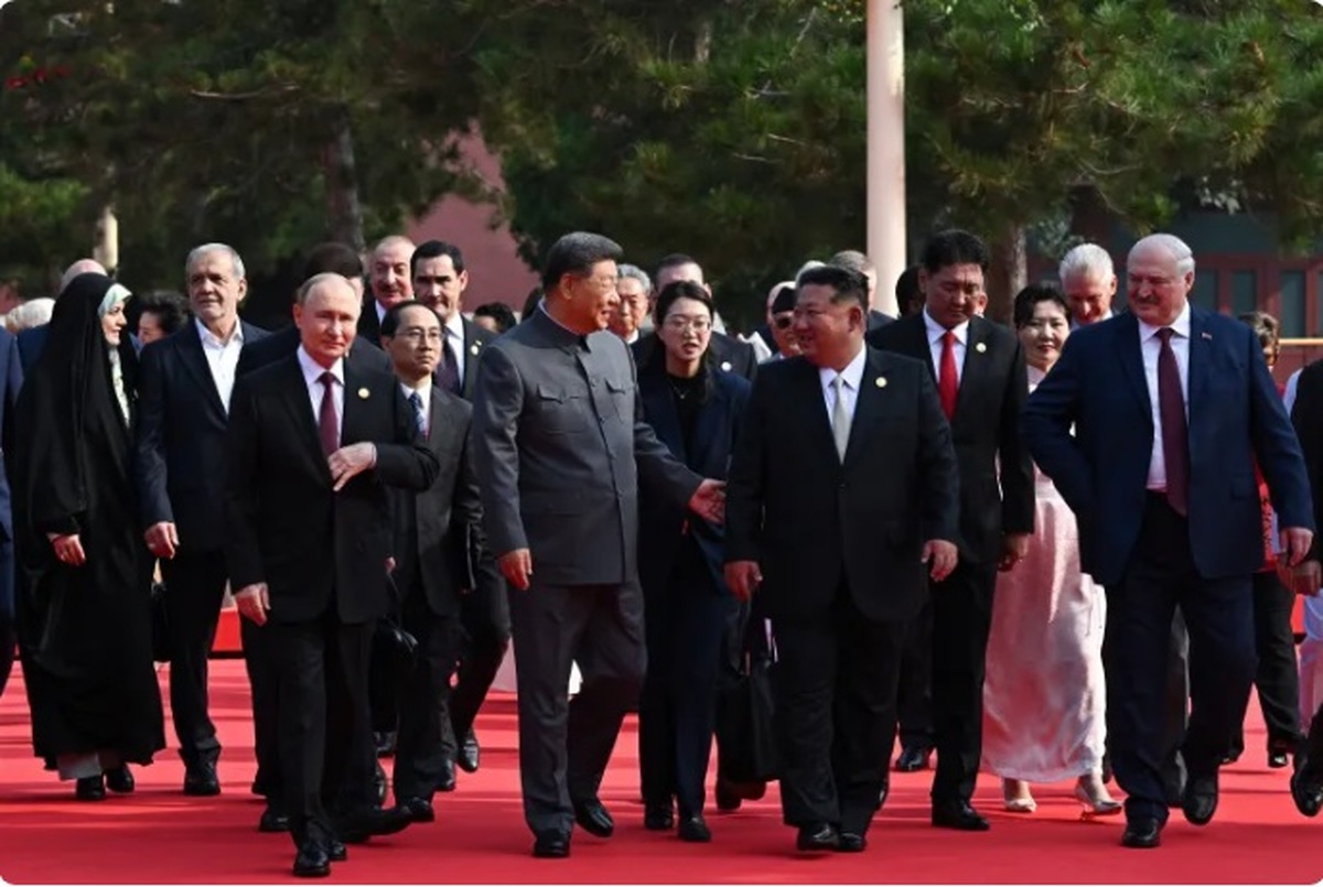 شی از مقابل "دروازه آسمانی" که مائو تسه تونگ، رهبر چین در سال ۱۹۴۹ تأسیس چین را از آنجا اعلام کرد، تاکید کرد که رنسانس کشورش "غیرقابل توقف" است و در حالی که ولادیمیر پوتین، رئیس جمهور روسیه و کیم جونگ اون، رهبر کره شمالی در کنار او بودند، هشدار داد که جهان با یک انتخاب سرنوشت ساز بین "صلح یا جنگ" روبرو است.