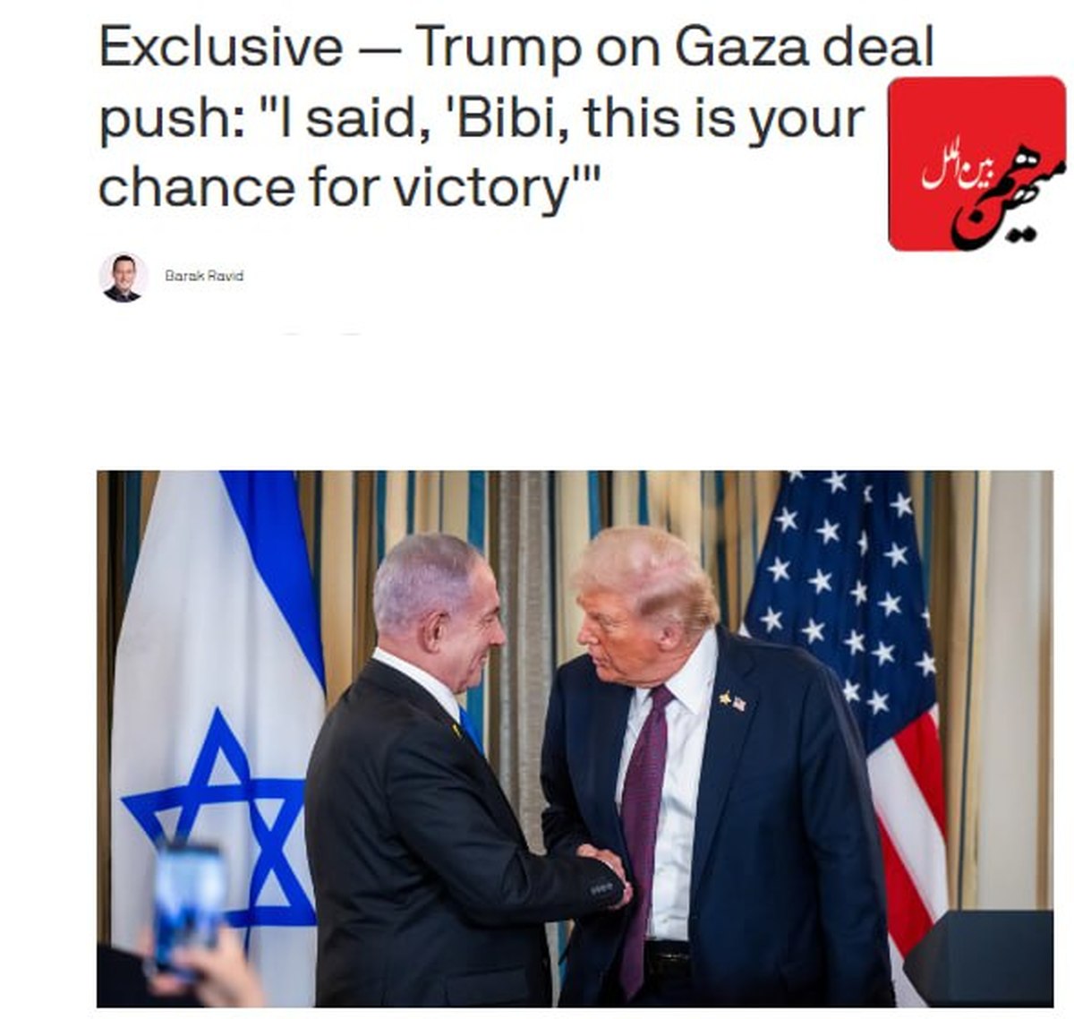 ترامپ روز شنبه به اکسیوس گفت که "ما به توافق صلح در غزه نزدیک هستیم" و گفت که برای نهایی کردن آن در چند روز آینده تلاش خواهد کرد. ترامپ به من گفت: "من گفتم، بیبی، این شانس تو برای پیروزی است." او با آن مشکلی نداشت. "او باید با آن مشکلی نداشته باشد. او چارهای ندارد. با من، تو باید مشکلی داشته باشی."
