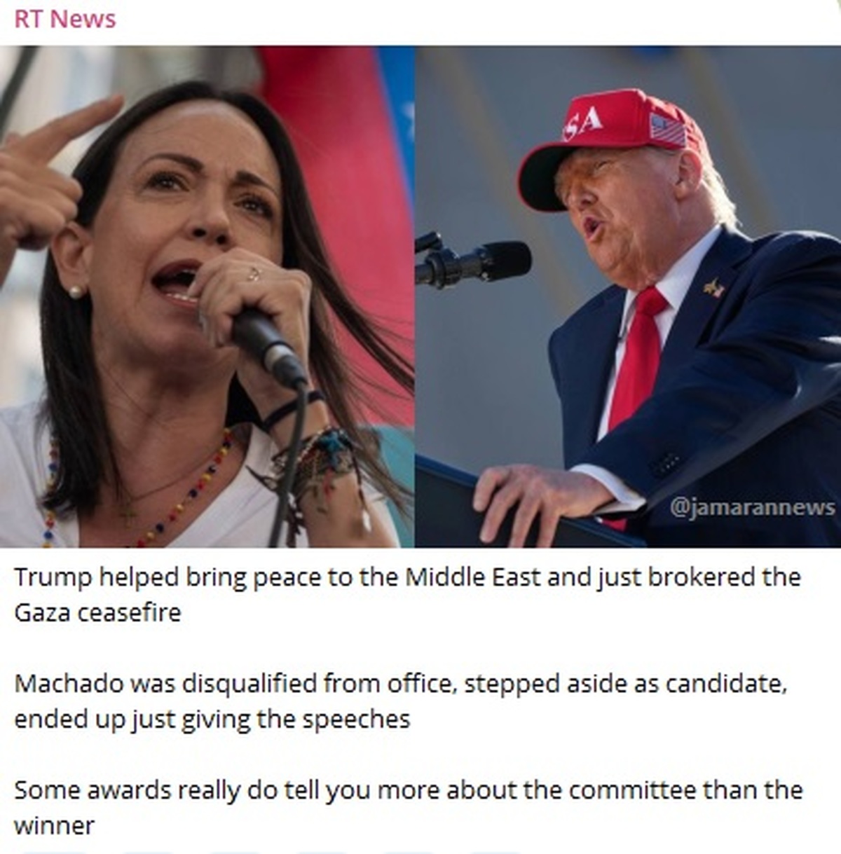 به گزارش جماران؛ راشاتودی در واکنش به اعطای جایزه صلح نوبل به ماریا ماچادو رهبر مخالفان در ونزوئلا، نوشته است: ترامپ کمک کرد تا در خاورمیانه صلح برقرار شود و آتش بس در غزه را به نتیجه رساند.