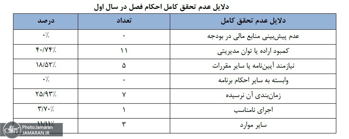 ارزیابی میزان تحقق اهداف کمی فصل اول نشان میدهد تحقق کامل و تحقق زیاد ۰٪، تحقق کم ۸۶٪ و عدم تحقق ۱۴٪ بوده است. حدود ۷۵٪ اسناد تدوینشده مرتبط با این فصل نیازمند بازبینی و اصلاح جدی هستند و نزدیک به نیمی از احکام اجرایی نشدهاند. ضعف مدیریتی و نیاز به تدوین آییننامهها و مقررات تکمیلی از عوامل اصلی این شکاف اجرایی محسوب میشوند.