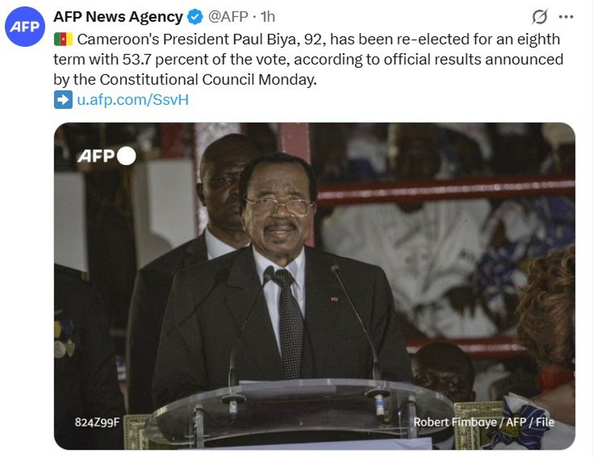بر اساس نتایج رسمی اعلام شده توسط شورای قانون اساسی کامرون، پاول بیا، رئیس جمهور ۹۲ ساله این کشور، با کسب ۵۳.۷ درصد آرا برای هشتمین دوره متوالی به عنوان رئیس جمهور این کشور آفریقایی انتخاب شد.