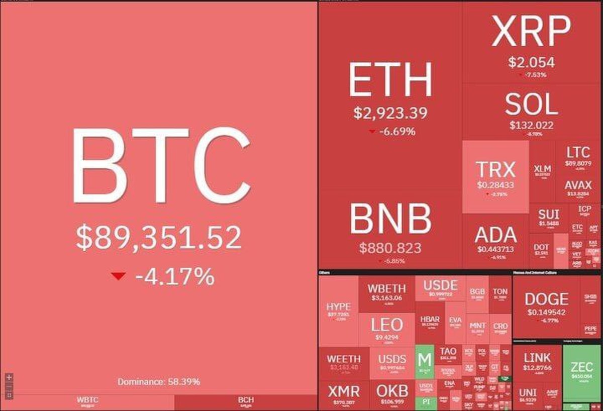 بیتکوین (BTC) تنها در عرض چند ساعت ۳,۸۹۹ دلار از دست داد و به ۸۹,۰۷۰ دلار سقوط کرد؛ افت منفی ۴.۱۹ درصدی که موجی از معاملات شتابزده را در بین سرمایهگذاران خرد و کلان رقم زد.