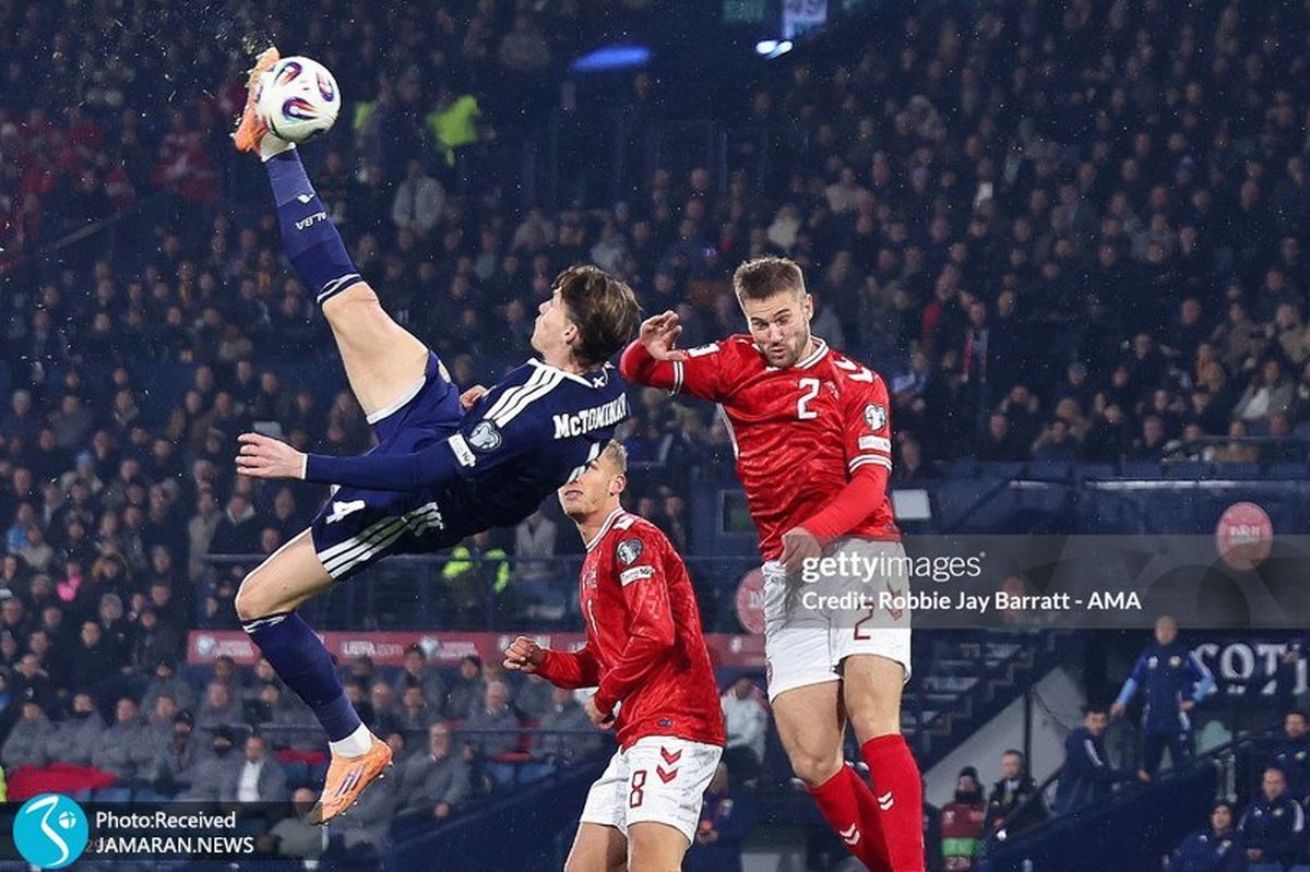 جماران ورزشی؛ در جریان دیدار تیم های ملی فوتبال اسکاتلند و دانمارک در انتخابی جام جهانی ۲۰۲۶، اسکات مک تومینای یک گل با ضربه برگردان وارد دروازه دانمارک کرد.