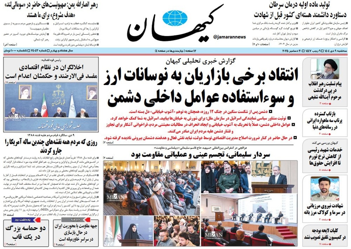 کدخبر: ۱۶۹۳۱۰۴ تاریخ انتشار: ۱۴۰۴/۱۰/۰۹ ۰۳:۲۲:۰۰ واکنش کیهان به اعتراض بازاریان تهران + عکس تیتر یک روزنامه کیهان: انتقاد برخی بازاریان به نوسانات ارز و سوءاستفاده عوامل داخلی دشمن مشاهده خبر در جماران اخبار مرتبط تصاویری از اعتراض بازاریان تهران در روز دوشنبه 8 دی 1404 کیهان: آقای پزشکیان! شما نباید جای فردی توانمند و شایسته را غصب میکردید جوادی یگانه: یادداشت کیهان یک مغالطه آشکار است/ مردم هم» از مشکلات اقتصادی ریز و درشت رنج میبرند و هم از محدودیتها و مداخلههای غیرلازمی که زندگی را بر آنها سخت کرده/ مسائلی چون رفع فیلترینگ که خواسته غالب مردم است هیچ هزینهای ندارد کیهان به مشاور سابق روحانی توهین کرد: او نوکر خانه زاد امریکایی هاست/ حمید ابوطالبی: آیا کارنامهی شما جز تقدیس فقر و توجیه ناتوانیِ قدرت، میراثی برای این ملت بهجا گذاشته است؟ در این چند دهه، هر صدای عقلانی را با برچسب دشمنی و غربزدگی خفه کردهاید هشدار کیهان به جوانان: آب یخ نخورید، می میرید! با این اوضاع اقتصادی اطرافیان را به دردسر نیندازیم! لینک کوتاه: کلمات کلیدی روزنامه کیهان اعتراض در بازار تهران اعتراض بازاریان تهران اعتراض بازار تهران