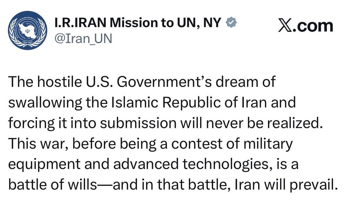 نمایندگی ایران نزد سازمان ملل متحد اعلام کرد: رویای دولت متخاصم ایالات متحده برای بلعیدن جمهوری اسلامی ایران و تسلیم کردن آن هرگز محقق نخواهد شد.