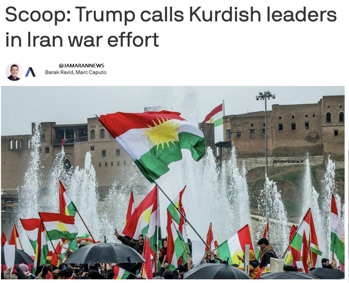 پایگاه خبری «اکسیوس» مدعی شد دونالد ترامپ همزمان با آغاز جنگ با ایران، تماسهای مستقیم و حساسی با مسعود بارزانی و بافل طالبانی، دو رهبر اقلیم کردستان عراق، برقرار کرده است. به نوشته این رسانه، بنیامین نتانیاهو طی ماههای گذشته برای فعال شدن نقش کردها در معادلات مرتبط با ایران لابی کرده و حتی بر این باور بوده که کردها ممکن است وارد میدان شوند.