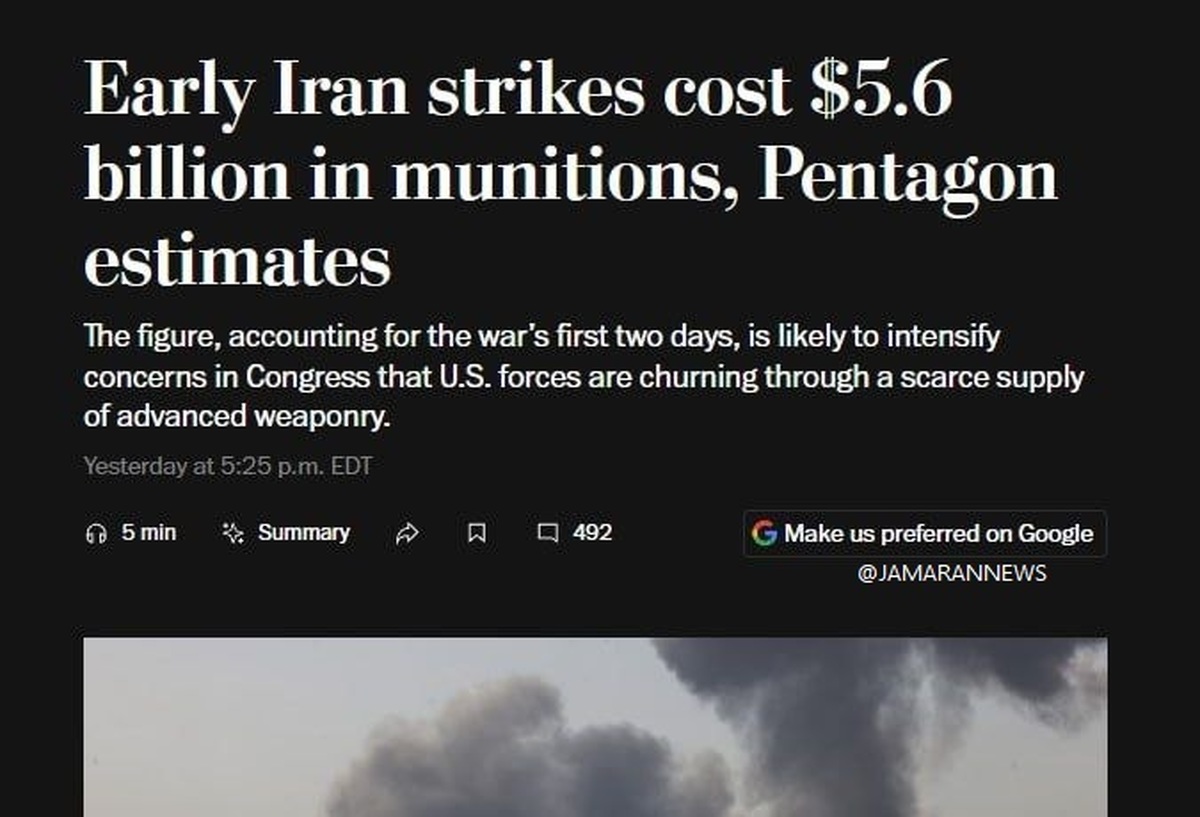 به گزارش جماران؛ واشنگتن پست به نقل از مقامات آمریکایی گزارش داد: ارتش آمریکا در دو روز اول حمله به ایران، ۵.۶ میلیارد دلار مهمات مصرف کرده است.