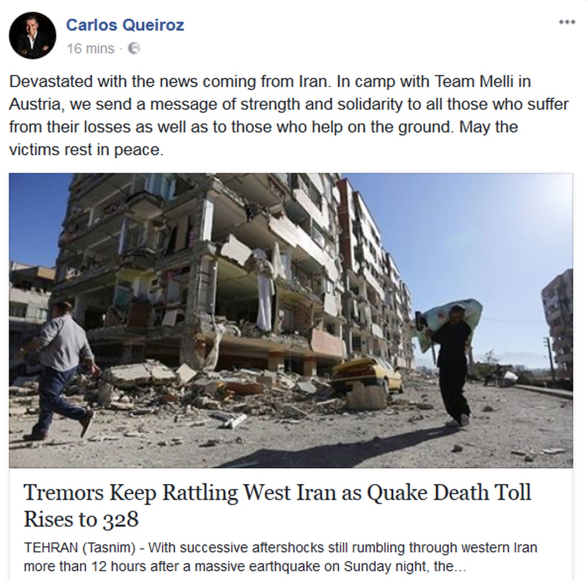 سرمربی تیم ملی در نخستین روز از زلزله کرمانشاه، با مردم آسیب دیده غرب کشور همدردی کرد و به آن ها گفت که قوی و متحد باشند.