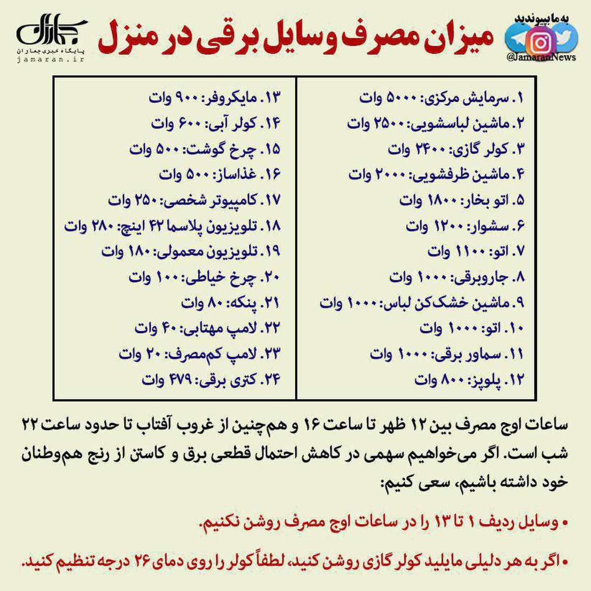 میزان مصرف وسایل برقی مختلف در منزل در جدول زیر نمایش داده شده است، با توجه به اینکه ساعات اوج مصرف برق بین ۱۲تا ۱۶ ظهر و ۲۰ تا ۲۴ شب است، از روشن کردن وسایل برقی پر مصرف در ساعات اوج مصرف خودداری کنیم.
