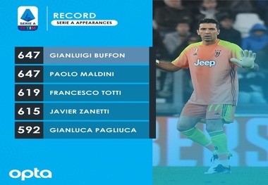 دروازهبان اسطورهای یوونتوس با قرارگرفتن در ترکیب تیمش به رکورد پائولو مالدینی در تعداد بازی در سری آ رسید.