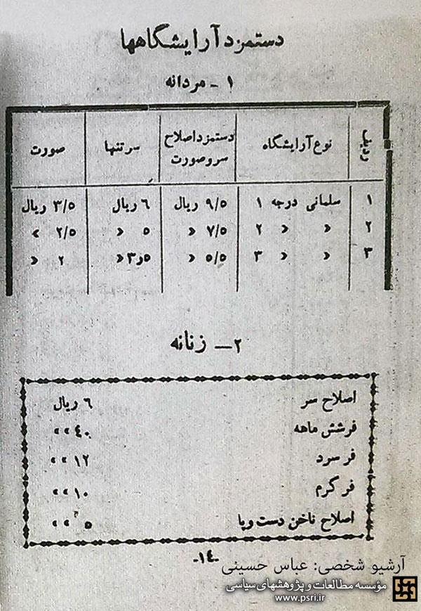 تصویری از دستمزد آرایشگاه زنانه و مردانه در سال 1328 منتشر شد.